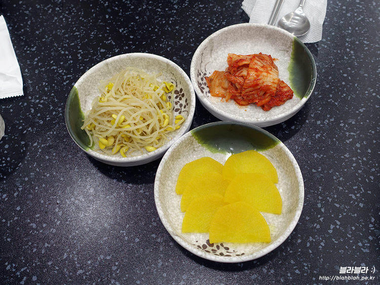 기본찬으로 나온 배추김치, 단무지, 콩나물