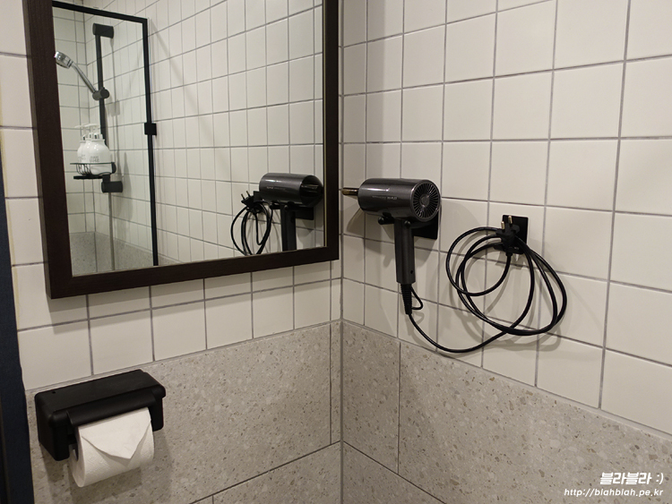 헤어드라이기가 화장실 안에 비치되어있어요.