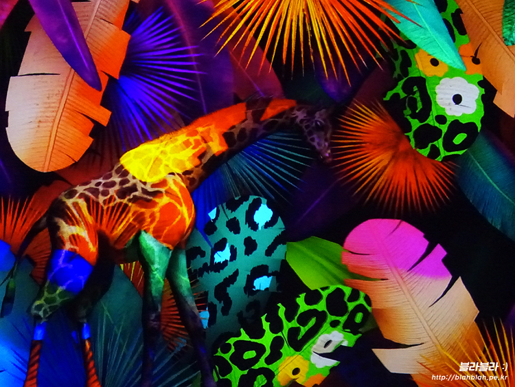 화려한 색으로 이루어진 정글속에 기린과