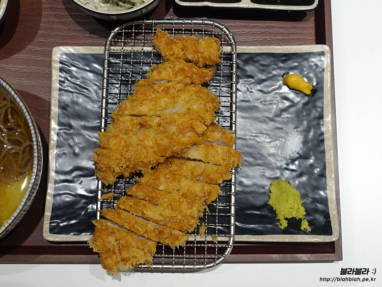 같이 제공되는 돈까스 소스와 와사비, 소금, 연겨자와