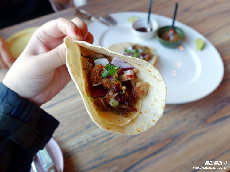 저 타코위에 갈색(?) 저거는 돼지고기인데