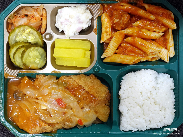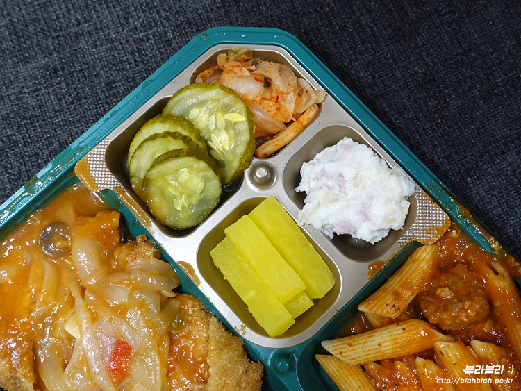 경양식돈까스와 미트볼펜네 그리고 4가지 반찬 구성의