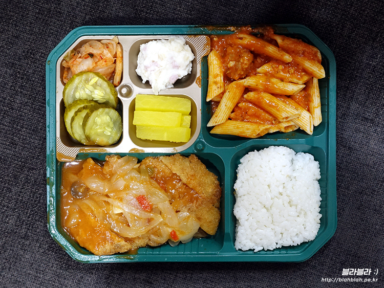 경양식돈까스와 미트볼펜네 그리고 4가지 반찬 구성의