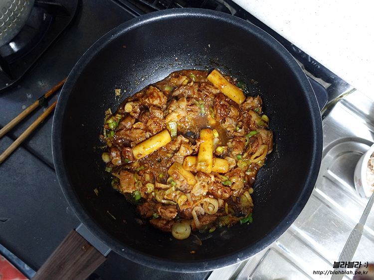 파기름을 내고 치킨을 잘라서 넣고 잘 볶아준다음