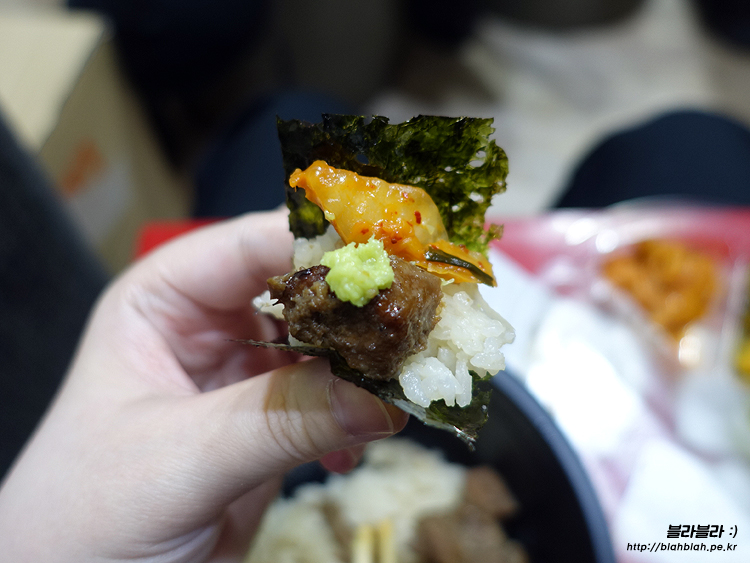 김에 밥이랑 고기올리고 볶음김치에 와사비까지!