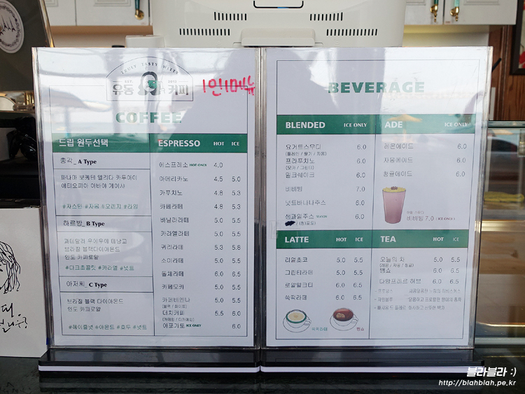 유동커피 메뉴와 가격입니다.