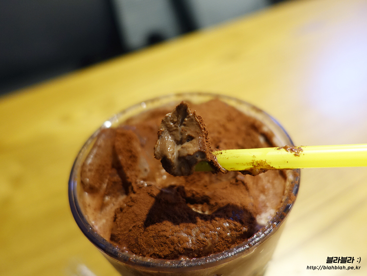음료위에 생초콜릿과 코코아파우더가 올려져있고