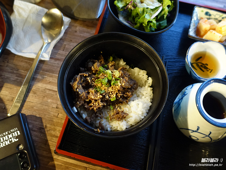 국물이 없는 바싹불고기가 밥 위에 올려져서 제공된답니다.