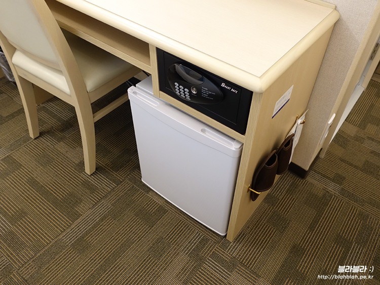 테이블 밑에는 금고와 작은 냉장고가 있답니다.