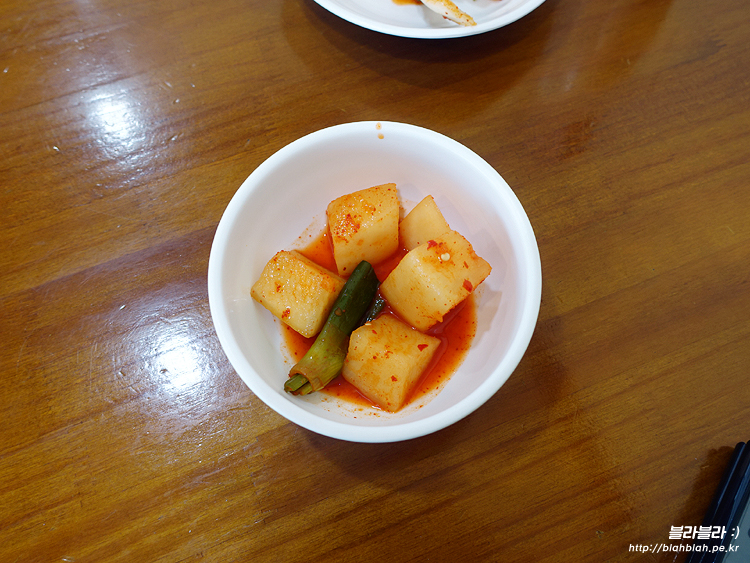 깍두기는 평범한 맛에 약간의 새콤함이 있었어요.