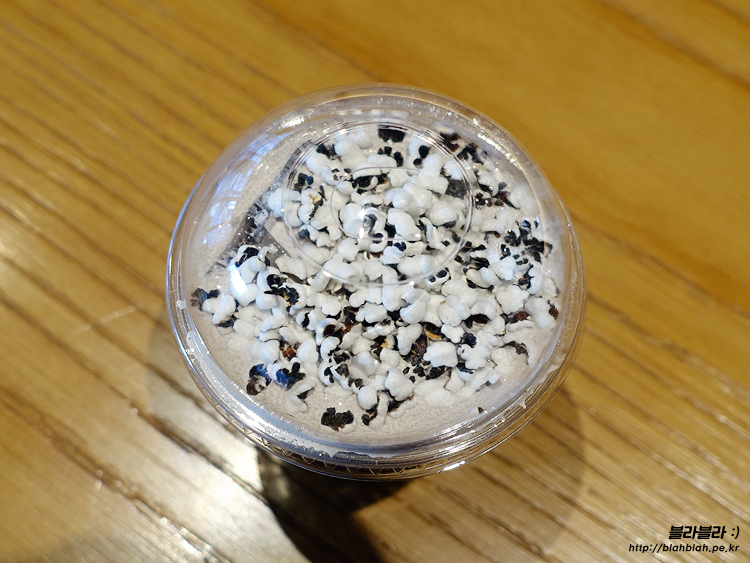 팝콘같이 생긴 흑미 팝 토핑이 뿌려져 있어요.
