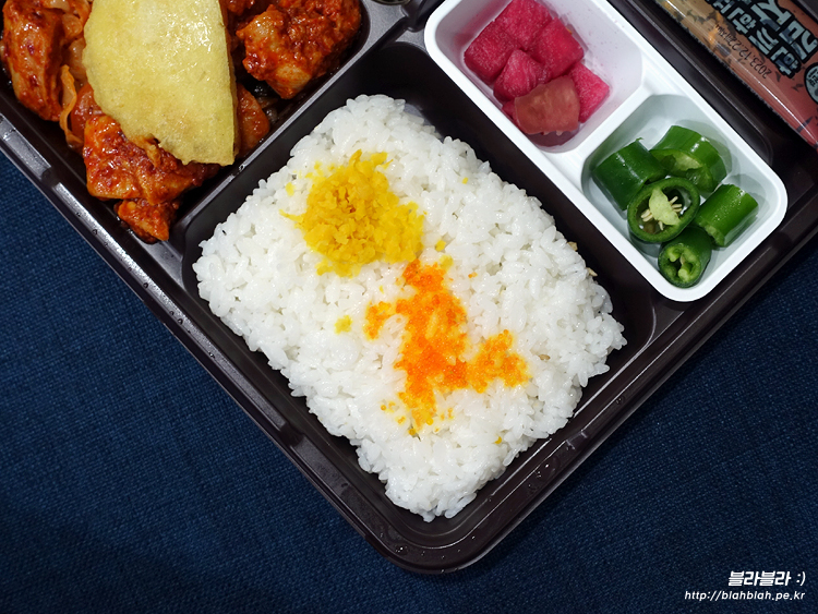 밥 위에 단무지 다진거랑 날치알이 올려져있고