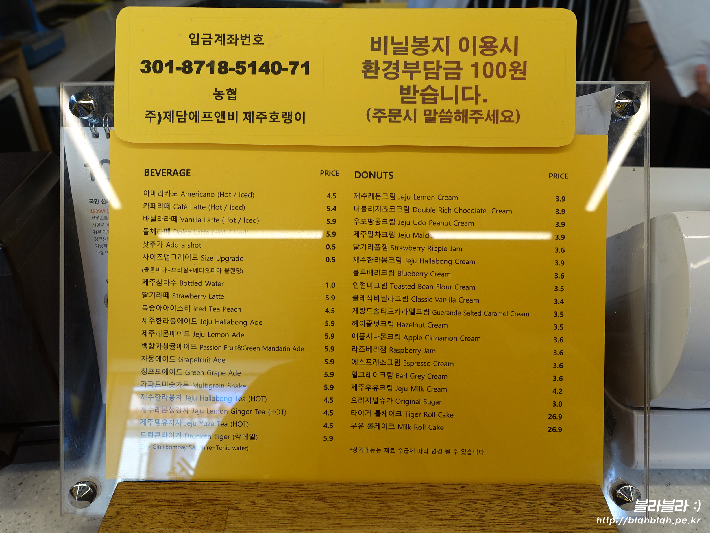 제주호랭이 메뉴와 가격입니다.