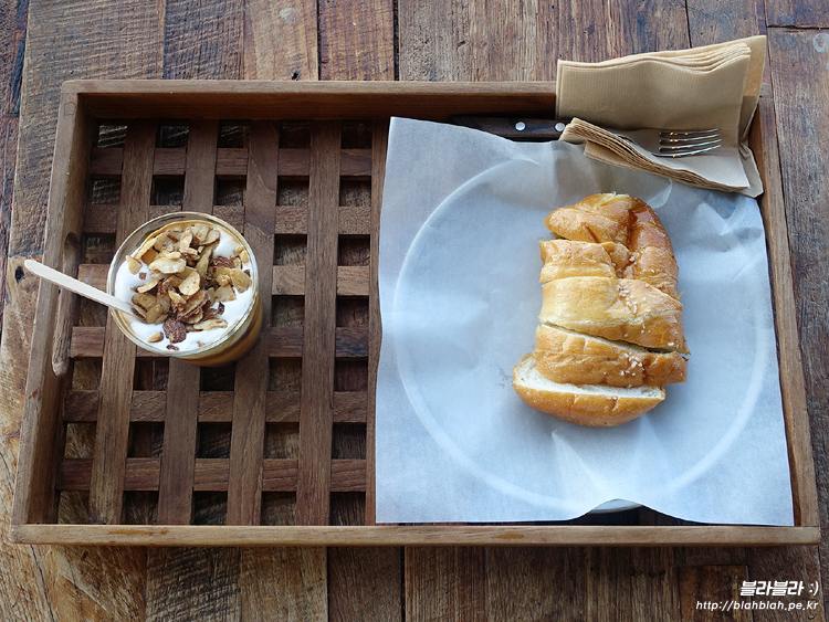 아몬드크림라떼와 소금빵을 주문했어요.