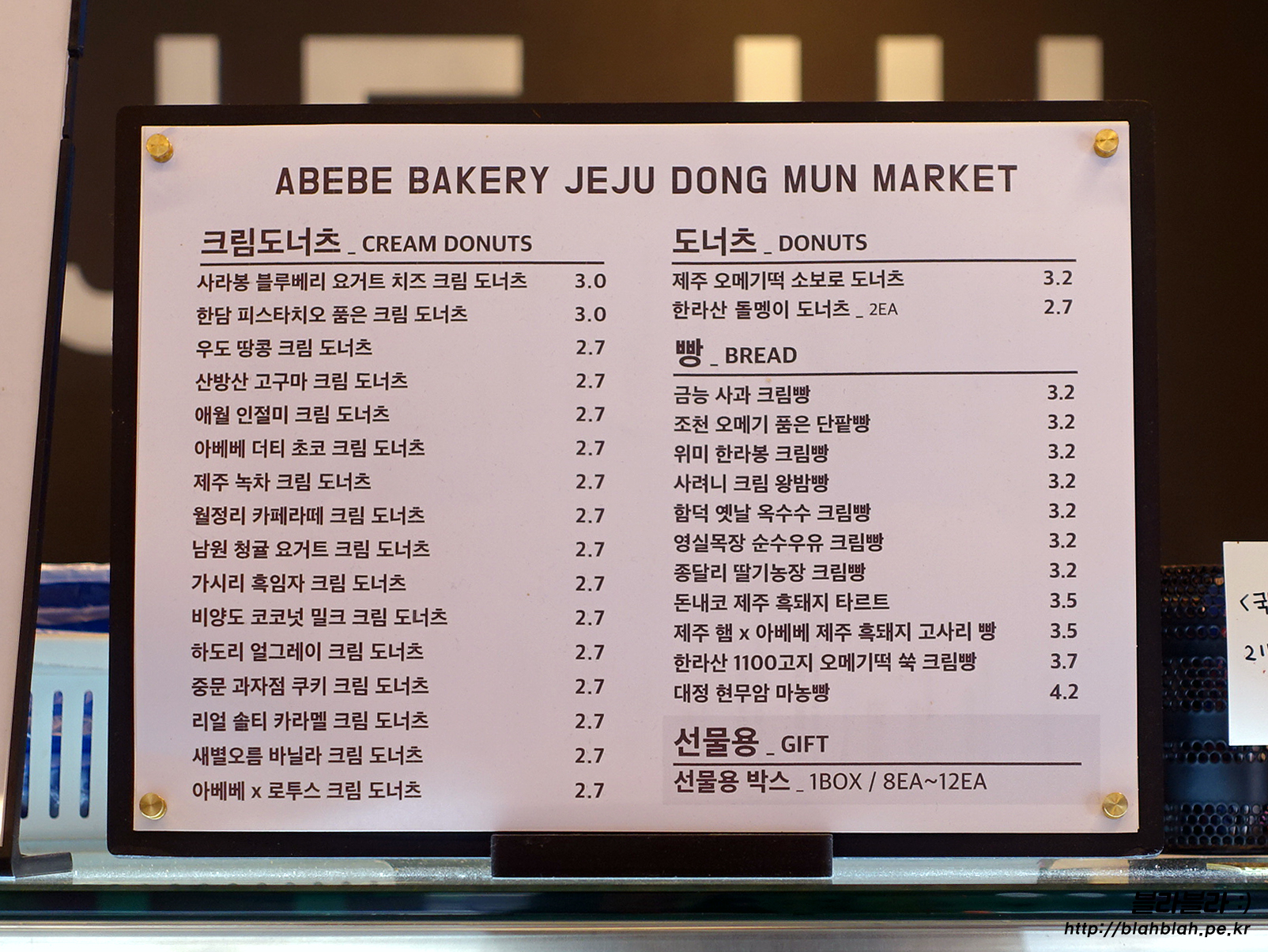 아베베베이커리 메뉴와 가격입니다.