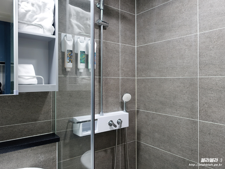 샤워부스가 있고 안에는 샴푸, 컨디셔너, 바디워시가
