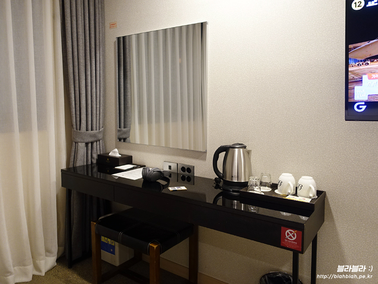 화장대 위에 전기포트와 컵과 차가 준비되어있어요.